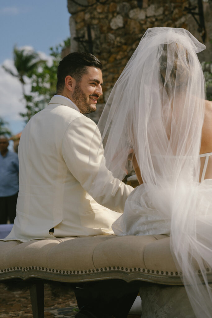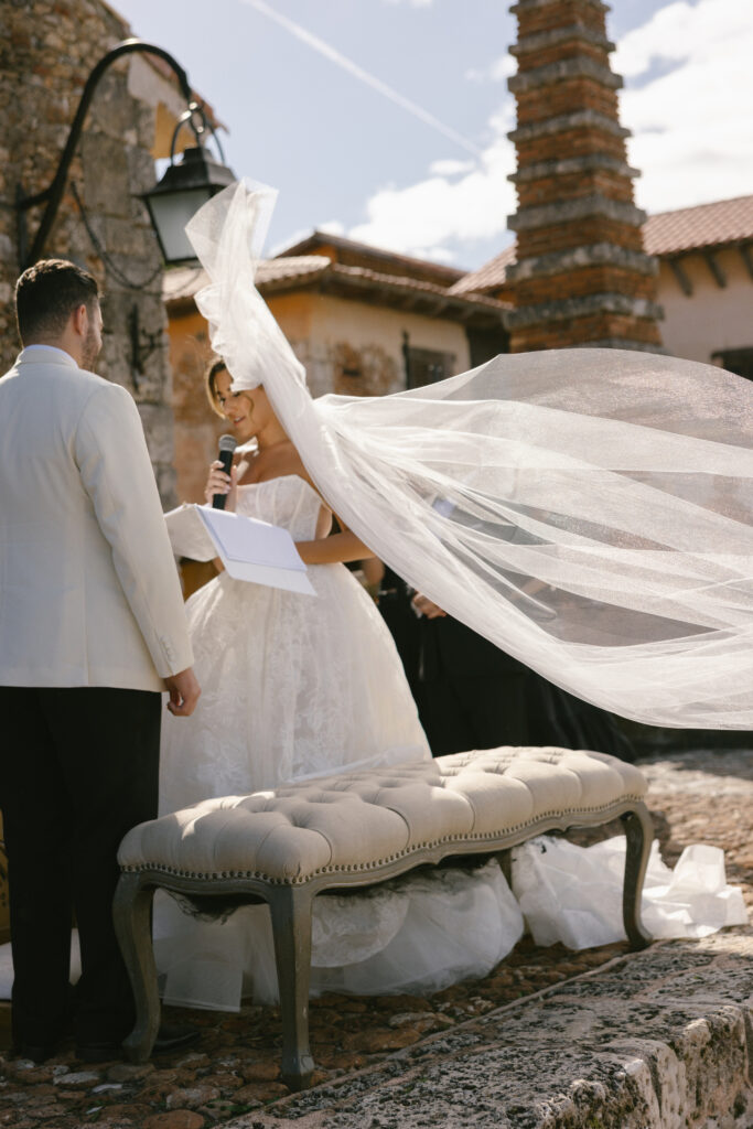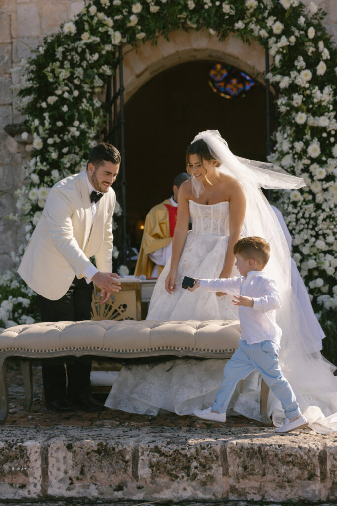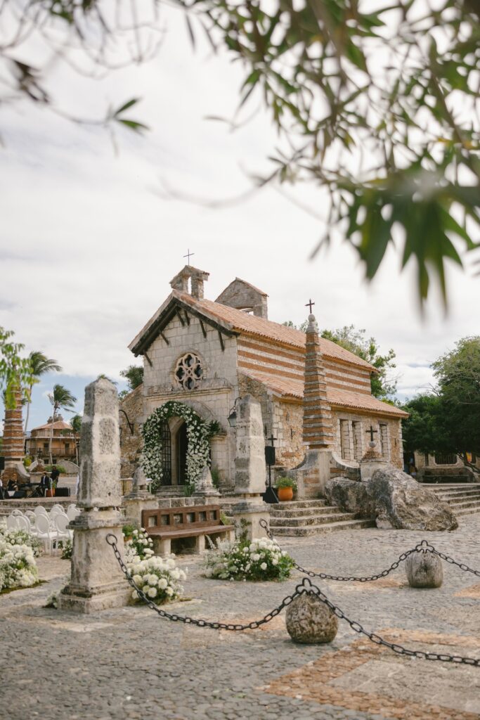 The ceremony took place in Altos de Chavon’s St Stanislaus Church, a setting inspired by an old Mediterranean village, so we kept the design elegant and timeless.