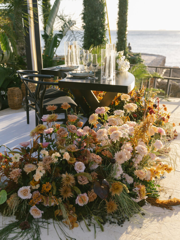 For the reception, we took things to the next level. Hosted in a private oceanfront villa, we spent over a week transforming the space. One of the biggest challenges—and highlights—was covering the pool to extend the seating area seamlessly, making it appear as if the pool had never been there. Overhead, a stunning clear roof structure supported by greenery and metal cage-like covers framed the space, blending organic nature with a modern design.