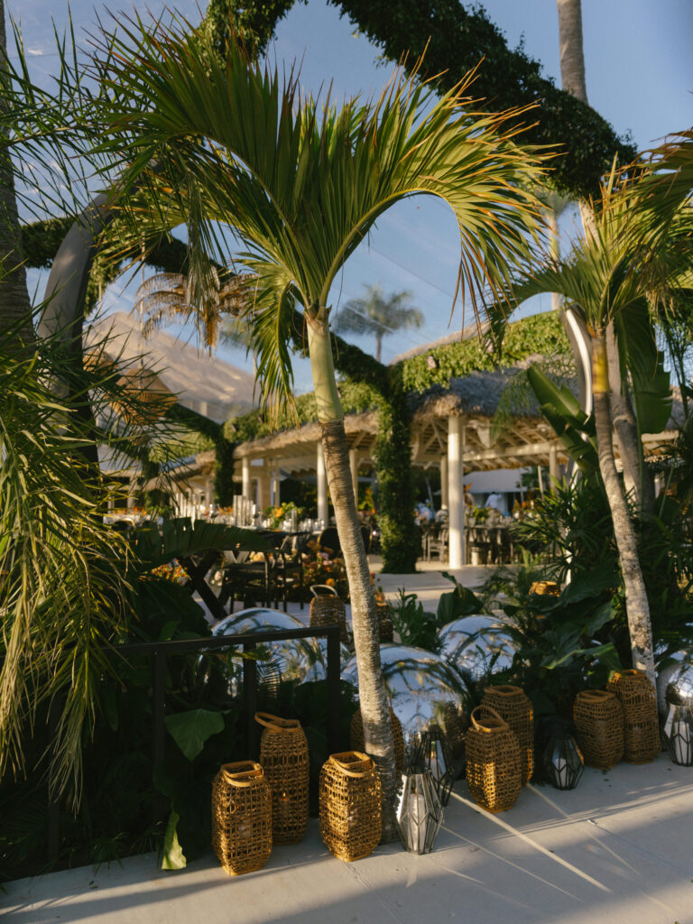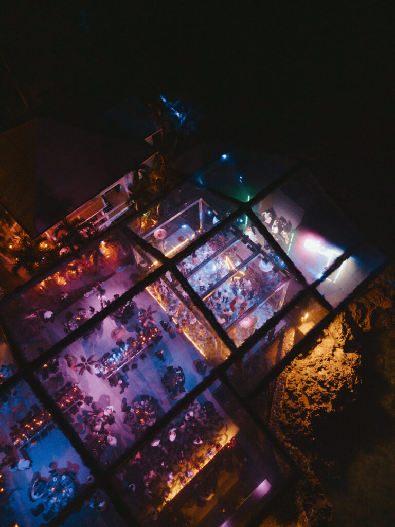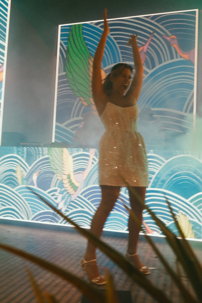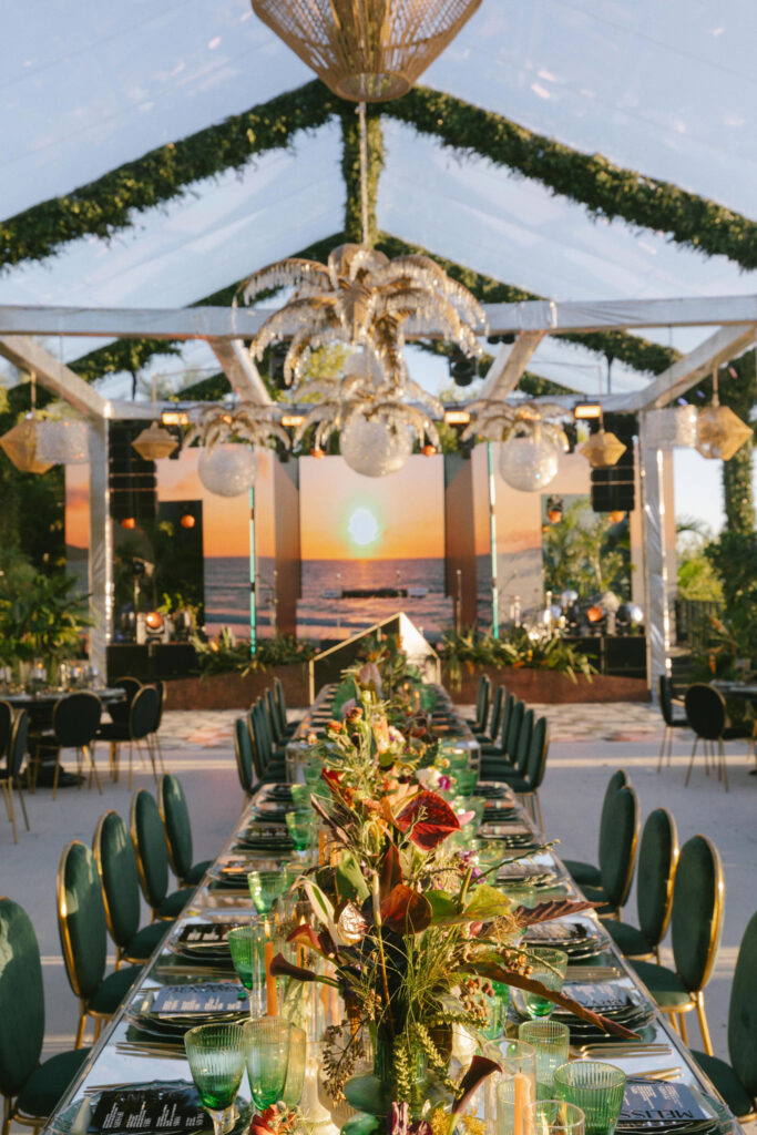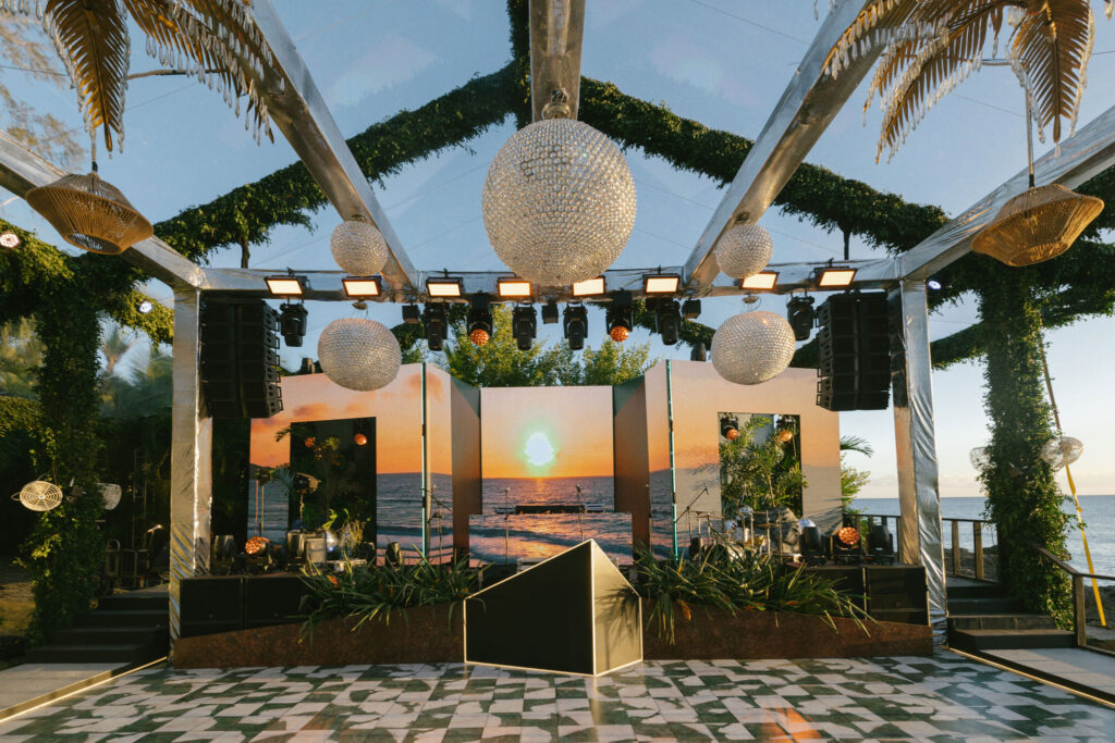 Since Allie & Juan love both NYC’s energy and the Caribbean’s natural beauty, we brought those worlds together. Tropical gardens blended into the villa’s existing vegetation, while modern touches like disco lights and custom structures (including a bold red bar and striking stage elements) added an urban edge.