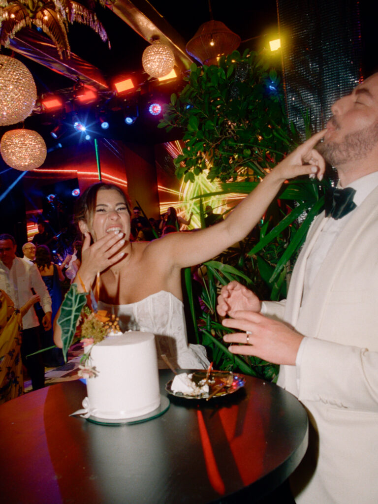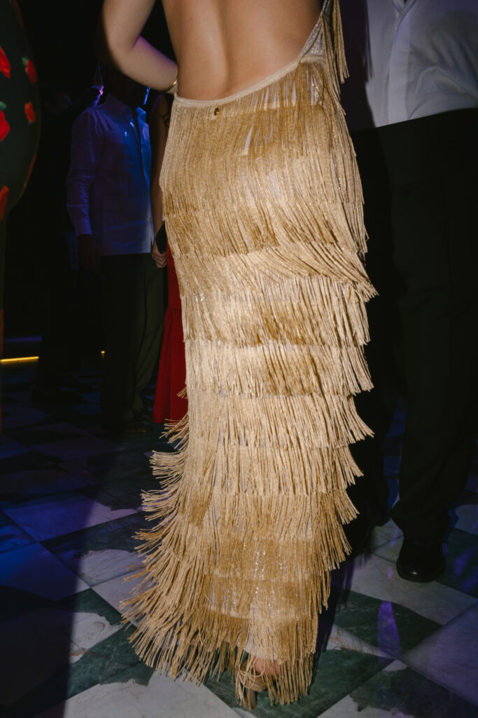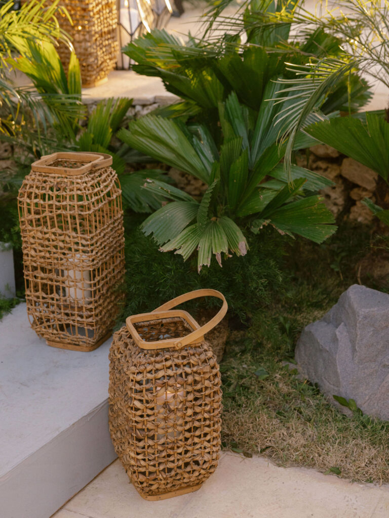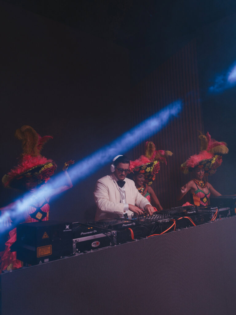 Since Allie & Juan love both NYC’s energy and the Caribbean’s natural beauty, we brought those worlds together. Tropical gardens blended into the villa’s existing vegetation, while modern touches like disco lights and custom structures (including a bold red bar and striking stage elements) added an urban edge.