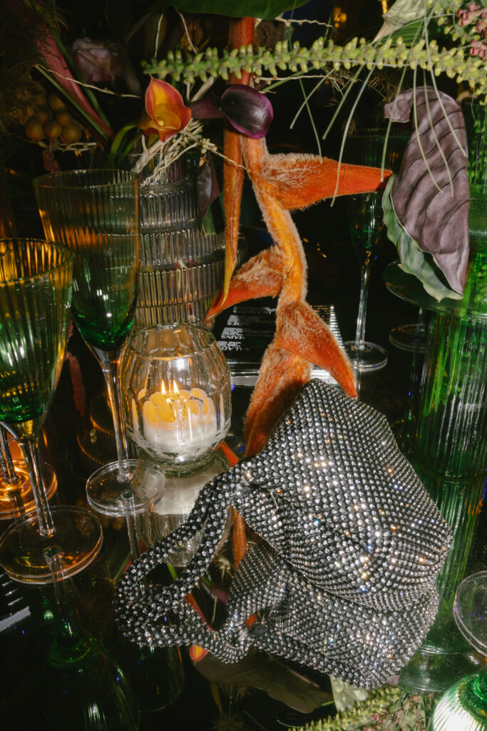 We played with different materials—wood, fabric, metal, marble, mirrors—to create depth and richness in every corner. Tables featured an eclectic mix of linens, surfaces, chairs, and tableware, making each setup feel unique yet cohesive.